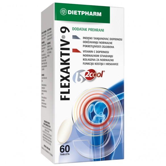 Flexaktiv® 9 tablete namijenjene su za očuvanje zdravlja hrskavice i kostiju te održavanje normalne pokretljivosti zglobova. Sadrže jedinstvenu kombinaciju 9 sastojaka među kojima su glukozamin, B-2Cool® nativni kolagen tipa II, suhi ekstrakt smole indijskog tamjanovca (Boswellia serrata), ekstrakt podanka kurkume (Curcuma longa), ekstrakt podanka đumbira (Zingiber officinale), vitamin C, cink, mangan i selen.
