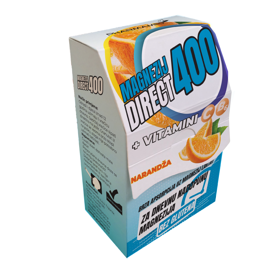 Magnezij 400 DIRECT s okusom narandže je dodatak prehrani koji sadrži magnezij, vitamin C i vitamin B6.